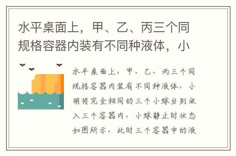 要解决这个问题,需结合物体浮沉条件和液体压强公式分析。三个完全相同的小球在不同液体中静止,液面相平,关键在于通过浮沉状态判断液体密度关系,进而比较浮力和容器底部压强。