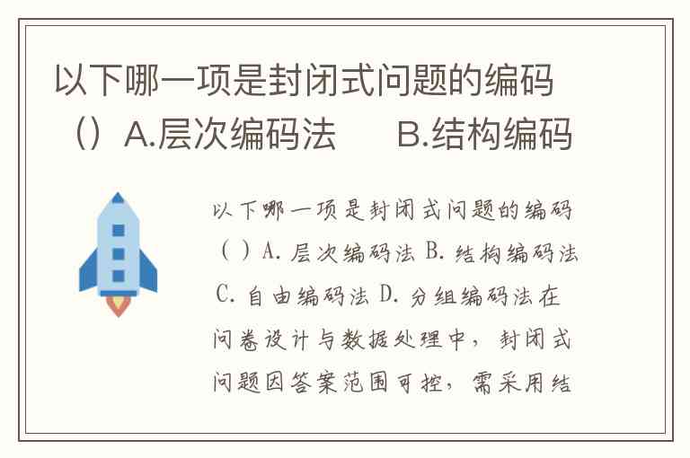 以下哪一项是封闭式问题的编码()A.层次编码法 B.结构编码法 C.自由编码法 D.分组编码法