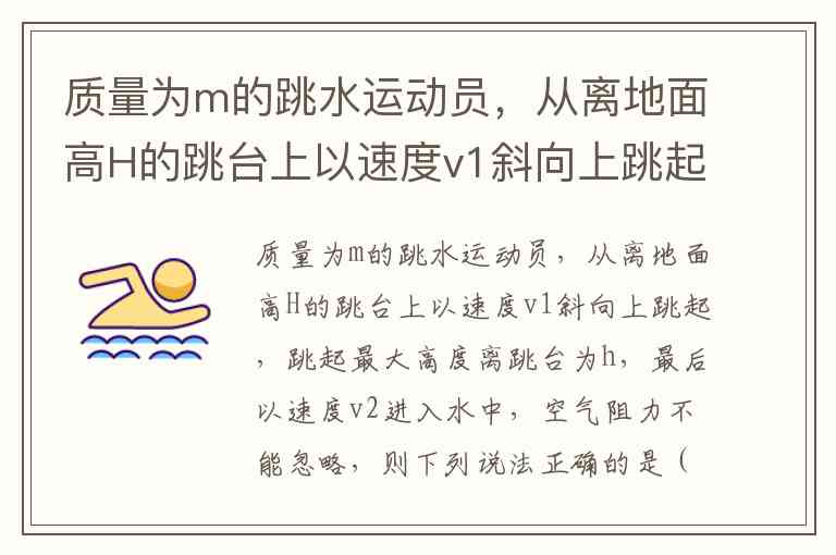质量为m的跳水运动员,从离地面高H的跳台上以速度v1斜向上跳起,跳起最大高度离跳台为h,最后以速度v2进入水中,空气阻力不能忽略,则下列说法正确的是( ) A. 运动员起跳时做的功为 mv B. 从起跳到入水,重力对运动员做的功为mgH C. 运动员克服空气阻力做的功为mg(H+h)- mv D. 运动员在下落过程中机械能总量保持不变