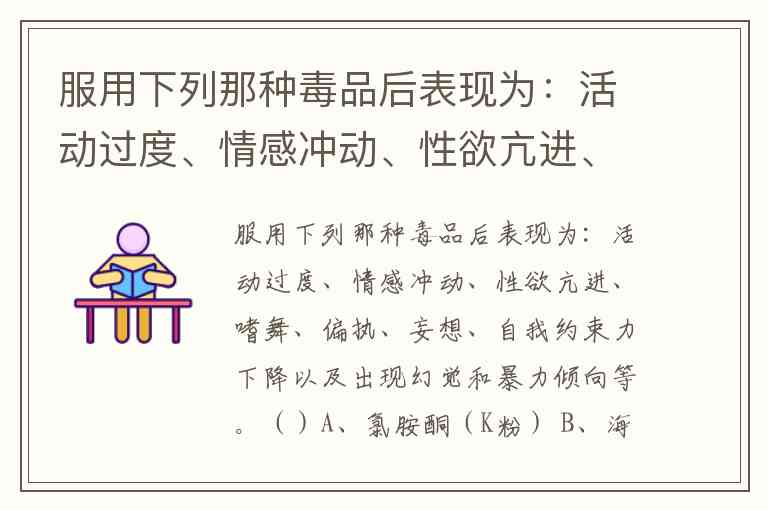 服用下列那种毒品后表现为:活动过度、情感冲动、性欲亢进、嗜舞、偏执、妄想、自我约束力下降以及出现幻觉和暴力倾向等。()A、氯胺酮(K粉) B、海洛因 C、摇头丸