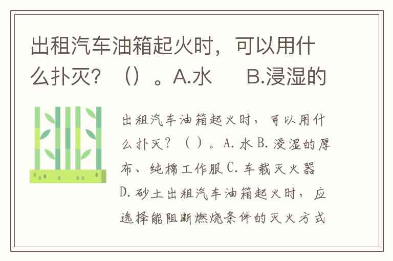 出租汽车油箱起火时,可以用什么扑灭?()。A.水 B.浸湿的厚布、纯棉工作服 C.车载灭火器 D.砂土