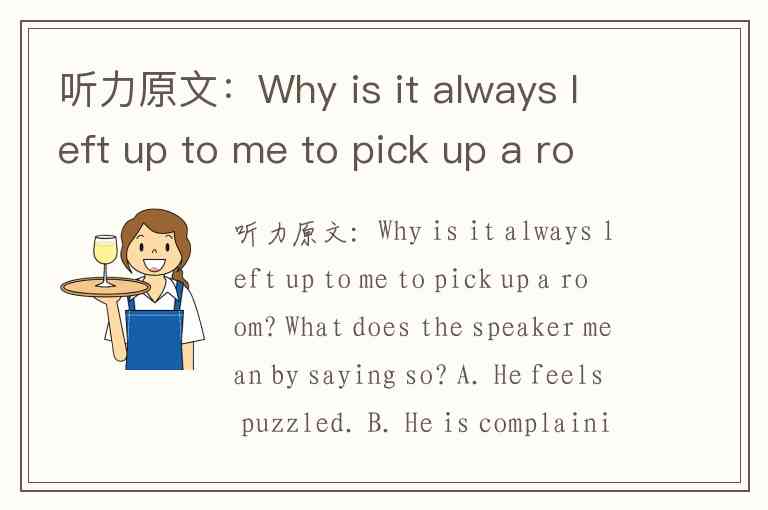 听力原文:Why is it always left up to me to pick up a room? What does the speaker mean by saying so? A. He feels puzzled. B. He is complaining. C. He is inquisitive. D. He is unsatisfied.