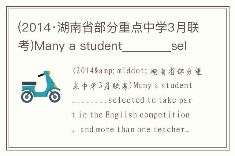 (2014·湖南省部分重点中学3月联考)Many a student________selected to take part in the English competition,and more than one teacher________them on speaking and writing. A. was;has coached B. were;have coached C. was;have coached D. were;has coached