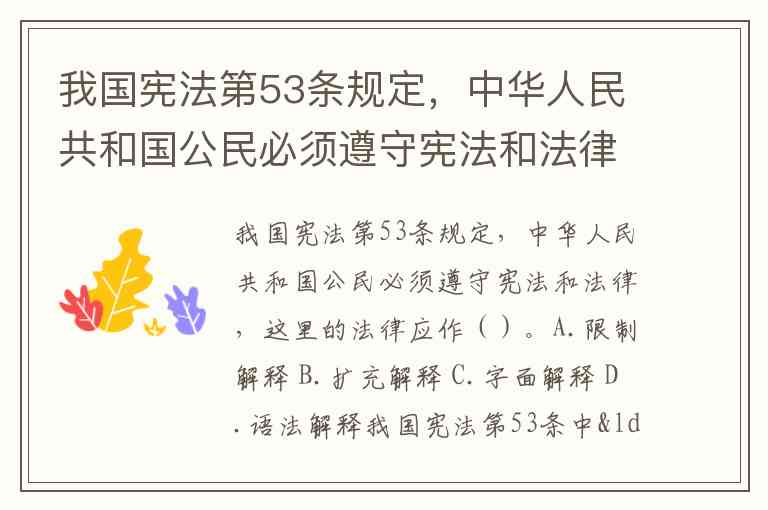 我国宪法第53条规定,中华人民共和国公民必须遵守宪法和法律,这里的法律应作()。A.限制解释 B.扩充解释 C.字面解释 D.语法解释