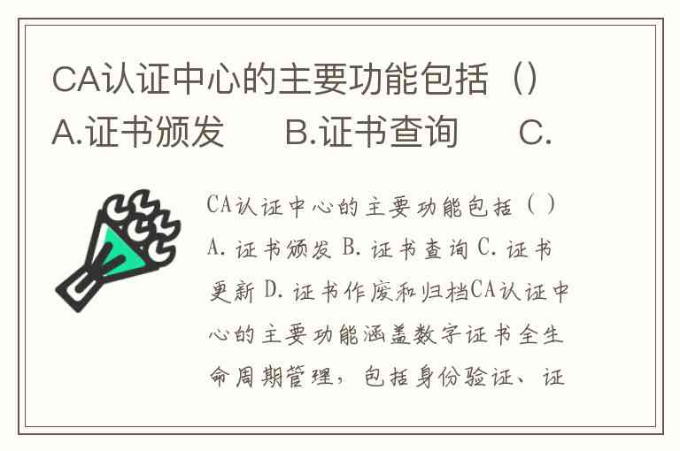 CA认证中心的主要功能包括()A.证书颁发 B.证书查询 C.证书更新 D.证书作废和归档