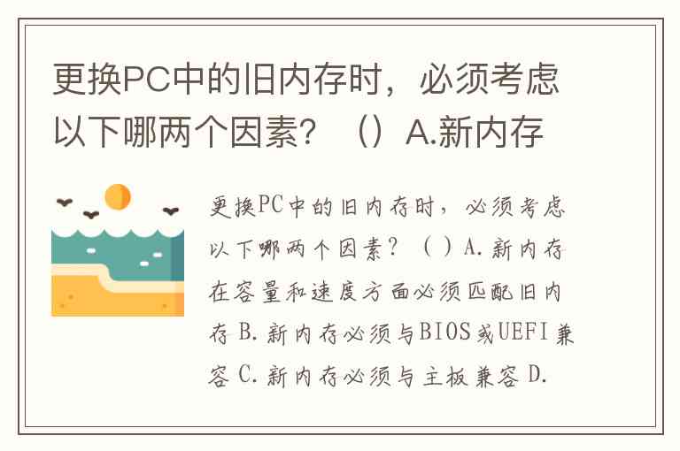 更换PC中的旧内存时,必须考虑以下哪两个因素?()A.新内存在容量和速度方面必须匹配旧内存 B.新内存必须与BIOS或UEFI兼容 C.新内存必须与主板兼容 D.电源必须提供新内存所需的电压 E.芯片组必须支持新内存的速度
