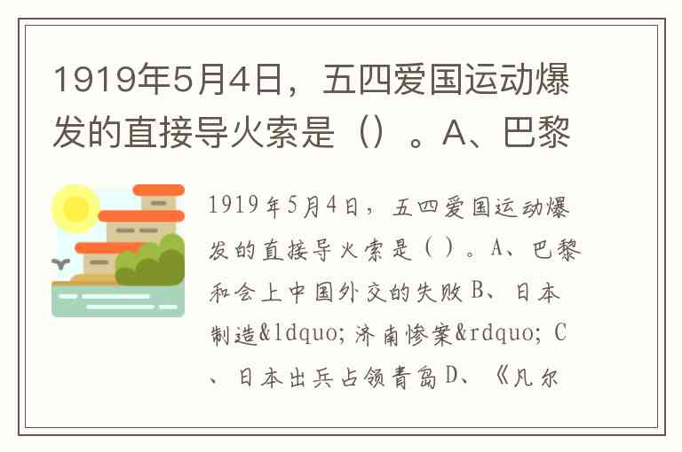 1919年5月4日,五四爱国运动爆发的直接导火索是()。A、巴黎和会上中国外交的失败 B、日本制造“济南惨案” C、日本出兵占领青岛 D、《凡尔赛和约》的签订