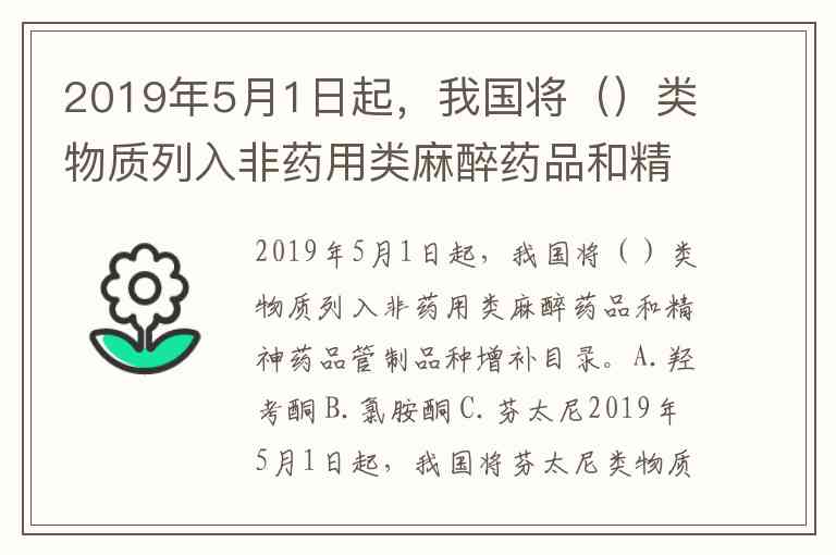 2019年5月1日起,我国将()类物质列入非药用类麻醉药品和精神药品管制品种增补目录。A.羟考酮 B.氯胺酮 C.芬太尼