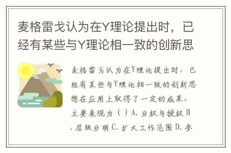 值得注意的是,层级分明(选项B)属于传统X理论的管理特征,强调通过严格控制和等级制度实现管理,与Y理论的分权化、扁平化主张相悖。而鼓励职工自主创新(选项E)虽然符合Y理论的精神内核,但现有文献中并未将其列为当时已取得实际应用成果的具体实践类型,更多是Y理论推导的理想管理目标而非既成事实。