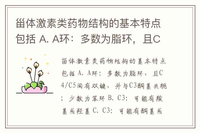 正确选项为A、C、D。这些结构特征不仅是化学鉴别的基础(如Δ4-3-酮的紫外吸收),更是理解激素作用机制的钥匙——为何看似相似的四环骨架,仅因取代基位置不同就能调控从糖代谢到生殖功能的复杂生理过程?