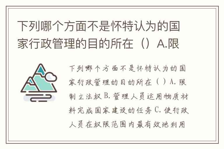 下列哪个方面不是怀特认为的国家行政管理的目的所在()A.限制立法权 B.管理人员运用物质材料完成国家建设的任务 C.使行政人员在权限范围内最有效地利用一切财源 D.以最经济、圆满的方式成功地完成政务计划