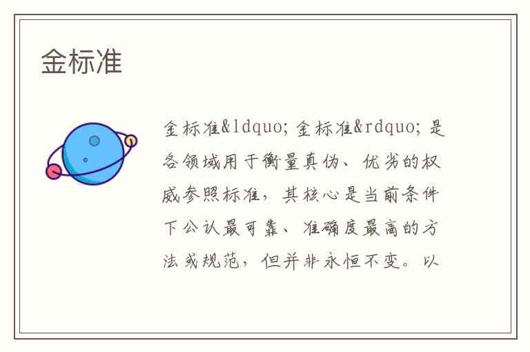 “金标准”是各领域用于衡量真伪、优劣的权威参照标准,其核心是当前条件下公认最可靠、准确度最高的方法或规范,但并非永恒不变。以下是不同领域的典型应用及特点: