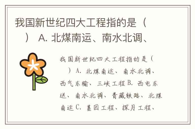 我国新世纪四大工程指的是( ) A. 北煤南运、南水北调、西气东输、三峡工程 B. 西电东送、南水北调、青藏铁路、北煤南运 C. 基因工程、探月工程、希望工程、三峡工程 D. 西电东送、南水北调、西气东输、青藏铁路