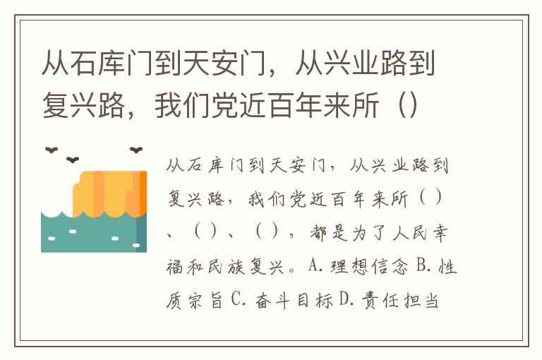 从石库门到天安门,从兴业路到复兴路,我们党近百年来所()、()、(),都是为了人民幸福和民族复兴。A.理想信念 B.性质宗旨 C.奋斗目标 D.责任担当