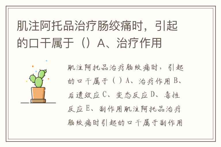 肌注阿托品治疗肠绞痛时,引起的口干属于()A、治疗作用 B、后遗效应 C、变态反应 D、毒性反应 E、副作用