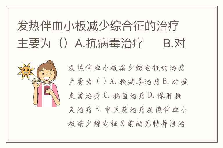 发热伴血小板减少综合征的治疗主要为()A.抗病毒治疗 B.对症支持治疗 C.抗菌治疗 D.保肝抗炎治疗 E.中医药治疗