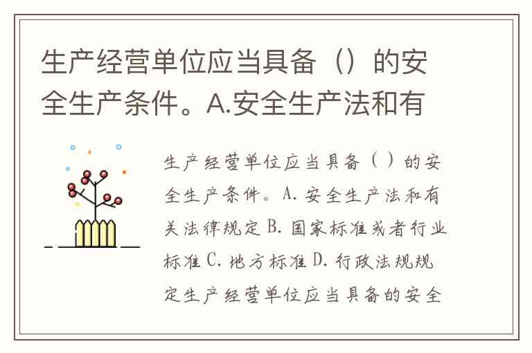 题目中符合法定要求的选项为 A.安全生产法和有关法律规定、B.国家标准或者行业标准、D.行政法规规定。三者共同构成安全生产条件的完整依据,缺一不可。而地方标准(选项C)因未被《安全生产法》明确列为依据,故不属于必须满足的条件。