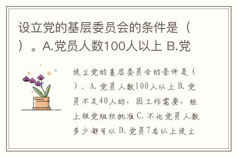 设立党的基层委员会的条件是()。A.党员人数100人以上 B.党员不足40人的,因工作需要,经上级党组织批准 C.不论党员人数多少都可以 D.党员7名以上