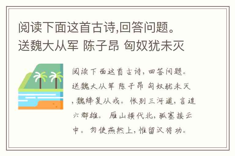 阅读下面这首古诗,回答问题。 送魏大从军 陈子昂 匈奴犹未灭,魏绛复从戎。怅别三河道,言追六郡雄。 雁山横代北,狐塞接云中。勿使燕然上,惟留汉将功。 【注】 1魏大:陈子昂的友人。姓魏,在兄弟中排行第一,故称。2魏绛:春秋晋国大夫,以和戎政策消除边患了而受金石之赏。3六郡雄:汉代名将赵充国,号称“六郡豪杰”。4代:代州。5狐塞:飞狐塞,边界驻军重地。6云中:云中郡,边塞重镇。7燕然:燕然山。东名将窦宪大破匈奴,乘胜追击,登上燕然山,刻石记功而返。 A. 首联暗用汉代骠骑将军霍去病“匈奴未灭,无以家为”的典故,抒发了以天下为己任的豪情。 B. 颔联“怅别”一语,写出了诗人与友人分别时的伤感。全诗情感由首联的激昂慷慨转入分手时的儿女缠绵、气哭悲切。 C. 颈联中的“横”“接”二字写出了雁山、飞狐塞等地地理位置的重要,它们是中原地区的屏障。这两句暗示魏大此行责任重大,为结句做了铺垫。