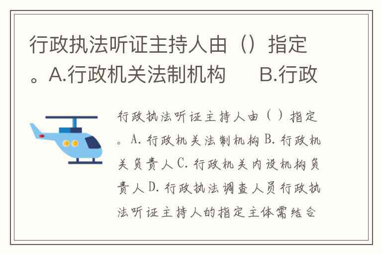 行政执法听证主持人由()指定。A.行政机关法制机构 B.行政机关负责人 C.行政机关内设机构负责人 D.行政执法调查人员