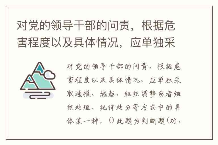 对党的领导干部的问责,根据危害程度以及具体情况,应单独采取通报、诫勉、组织调整或者组织处理、纪律处分等方式中的具体某一种。()此题为判断题(对,错)。