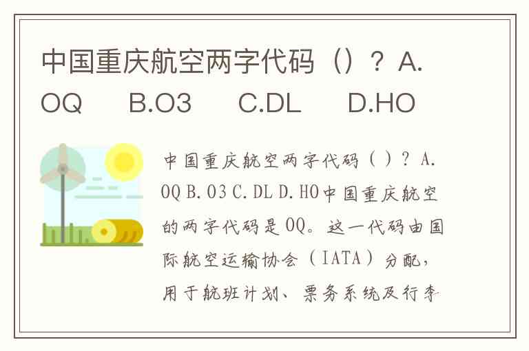 中国重庆航空的两字代码是 OQ。这一代码由国际航空运输协会(IATA)分配,用于航班计划、票务系统及行李标签等航空运营场景。根据最新资料显示,重庆航空自成立以来始终使用OQ作为其IATA两字代码,且近期多个来源均确认该代码未发生变更。