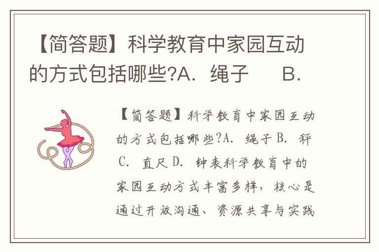 【简答题】科学教育中家园互动的方式包括哪些?A.绳子 B.秤 C.直尺 D.钟表