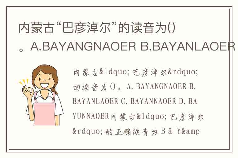 内蒙古“巴彦淖尔”的正确读音为 Bā Yàn Nào Ěr,对应选项 C.BAYANNAOER。这一读音源自蒙古语地名的汉语音译,其中“巴彦”意为“富饶的”,“淖尔”意为“湖泊”,合起来象征“富饶的湖泊”。