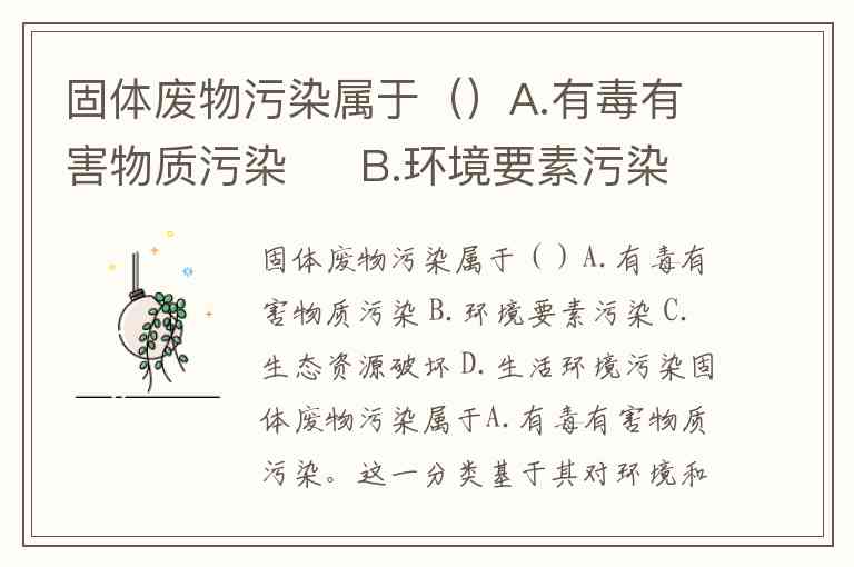 固体废物污染属于()A.有毒有害物质污染 B.环境要素污染 C.生态资源破坏 D.生活环境污染