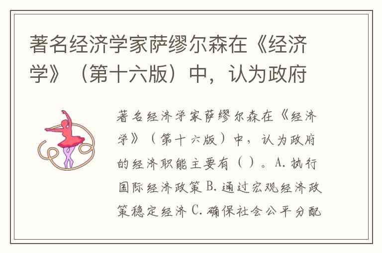 著名经济学家萨缪尔森在《经济学》(第十六版)中,认为政府的经济职能主要有()。A.执行国际经济政策 B.通过宏观经济政策稳定经济 C.确保社会公平分配的职能 D.提高经济效率 E.改善收入分配