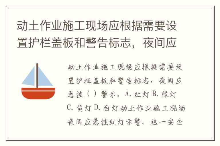 动土作业施工现场应根据需要设置护栏盖板和警告标志,夜间应悬挂()警示。A.红灯 B.绿灯 C.黄灯 D.白灯