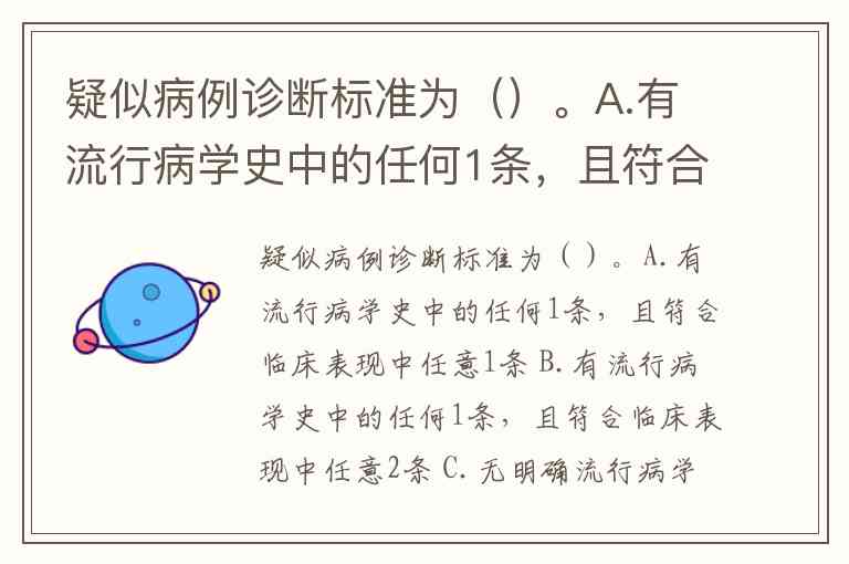 疑似病例诊断标准为()。A.有流行病学史中的任何1条,且符合临床表现中任意1条 B.有流行病学史中的任何1条,且符合临床表现中任意2条 C.无明确流行病学史的,符合临床表现中的3条