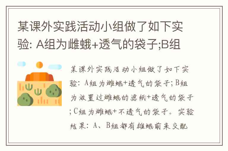 雌蛾通过分泌性信息素吸引雄蛾是昆虫繁殖的关键策略。实验中,A组(雌蛾+透气袋)和B组(放置过雌蛾的滤纸+透气袋)均能吸引雄蛾,而C组(雌蛾+不透气袋)无此效果,这表明雌蛾释放的化学信号是交配行为的核心驱动力,且该信号需通过空气传播。