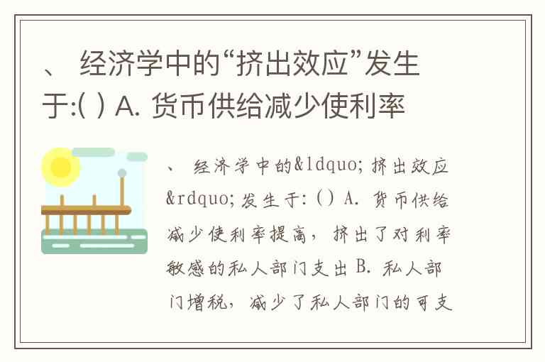 、 经济学中的“挤出效应”发生于:( ) A. 货币供给减少使利率提高,挤出了对利率敏感的私人部门支出 B. 私人部门增税,减少了私人部门的可支配收入和支出 C. .政府支出增加,提高了利率,挤出了对利率敏感的私人部门支出 D. 政府支出减少,引起消费支出下降
