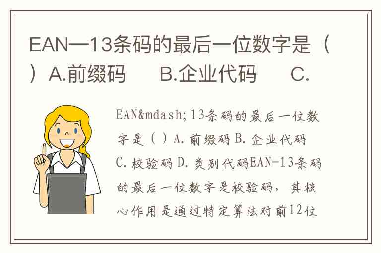 EAN—13条码的最后一位数字是()A.前缀码 B.企业代码 C.校验码 D.类别代码