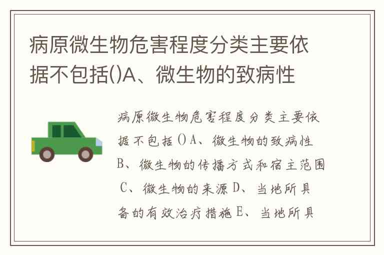 病原微生物危害程度分类主要依据不包括()A、微生物的致病性 B、微生物的传播方式和宿主范围 C、微生物的来源 D、当地所具备的有效治疗措施 E、当地所具备的有效预防措施