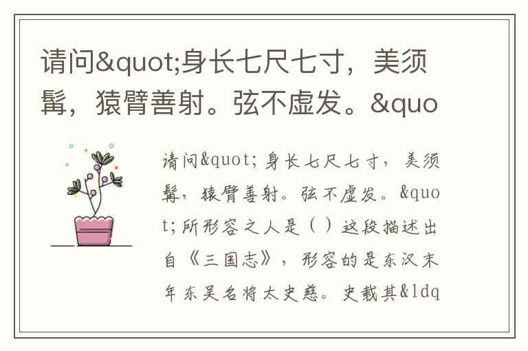 这段描述出自《三国志》,形容的是东汉末年东吴名将太史慈。史载其“长七尺七寸,美须髯,猿臂善射,弦不虚发”,不仅形象英武,更以神射之术闻名后世。