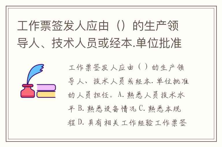 工作票签发人应由()的生产领导人、技术人员或经本.单位批准的人员担任。A.熟悉人员技术水平 B.熟悉设备情况 C.熟悉本规程 D.具有相关工作经验