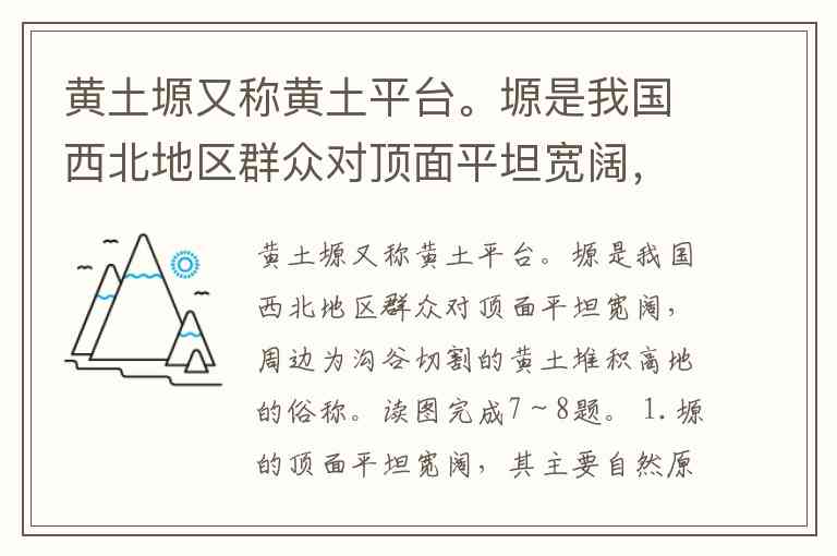 黄土塬又称黄土平台。塬是我国西北地区群众对顶面平坦宽阔,周边为沟谷切割的黄土堆积高地的俗称。读图完成7~8题。 1.塬的顶面平坦宽阔,其主要自然原因 A.风化、风蚀 B.流水侵蚀 C.流水沉积 D.风力沉积 2.为合理利用土地,保持水土,下列做法正确的是 ①甲地打坝淤地 ②乙处整修梯田 ③丙地修建水库 ④丁处平整土地 A.①② B.②③ C.③④ D.②④