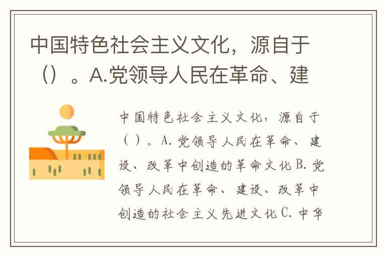 中国特色社会主义文化,源自于()。A.党领导人民在革命、建设、改革中创造的革命文化 B.党领导人民在革命、建设、改革中创造的社会主义先进文化 C.中华民族五千多年文明历史所孕育的中华优秀传统文化 D.中华民族长期以来积淀的古今中外文化交融的结果