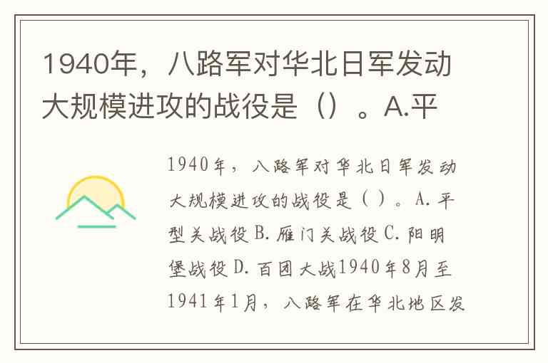 1940年,八路军对华北日军发动大规模进攻的战役是()。A.平型关战役 B.雁门关战役 C.阳明堡战役 D.百团大战