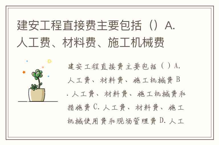 建安工程直接费主要包括()A.人工费、材料费、施工机械费 B.人工费、材料费、施工机械费和措施费 C.人工费、材料费、施工机械使用费和现场管理费 D.人工费、材料费、施工机械使用费和规费