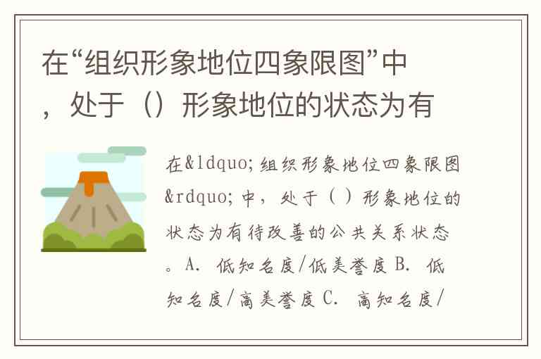 在“组织形象地位四象限图”中,处于()形象地位的状态为有待改善的公共关系状态。A.低知名度/低美誉度 B.低知名度/高美誉度 C.高知名度/低美誉度 D.高知名度/高美誉度