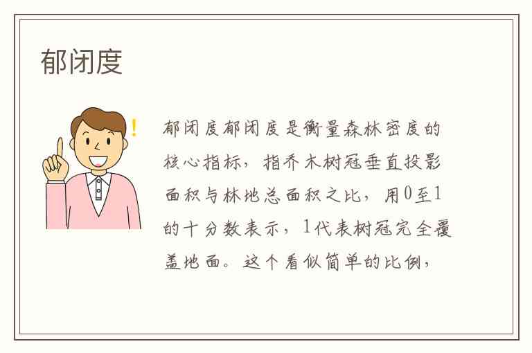 郁闭度是衡量森林密度的核心指标,指乔木树冠垂直投影面积与林地总面积之比,用0至1的十分数表示,1代表树冠完全覆盖地面。这个看似简单的比例,实则是森林生态系统的“晴雨表”——它决定了森林如何调节气候、涵养水源,甚至影响火灾风险与生物多样性。