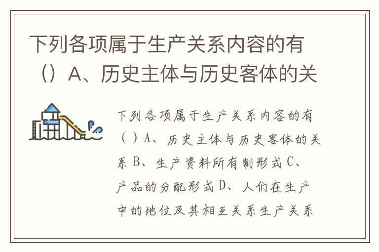 下列各项属于生产关系内容的有()A、历史主体与历史客体的关系 B、生产资料所有制形式 C、产品的分配形式 D、人们在生产中的地位及其相互关系