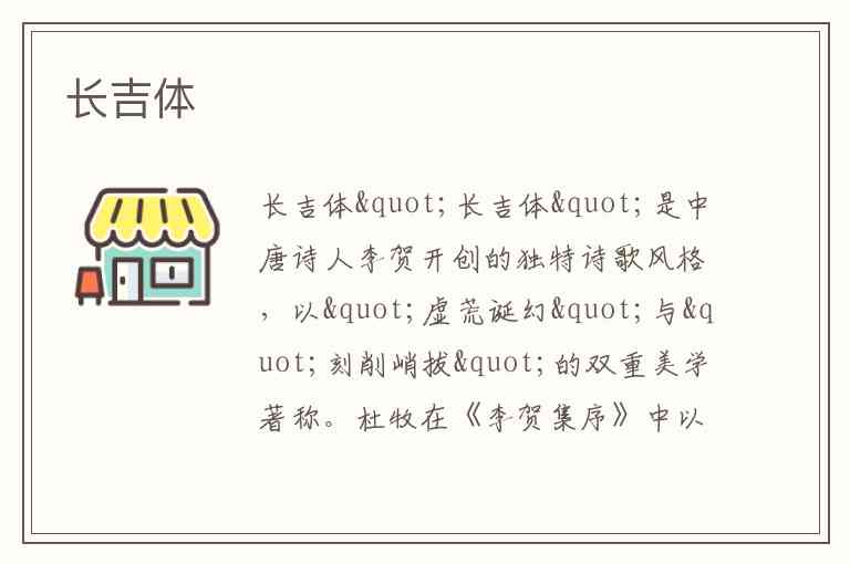 "长吉体"是中唐诗人李贺开创的独特诗歌风格,以"虚荒诞幻"与"刻削峭拔"的双重美学著称。杜牧在《李贺集序》中以"云烟绵联""水之迢迢"形容其情态,又以"牛鬼蛇神""虚荒诞幻"概括其瑰诡,而严羽《沧浪诗话》更直言"长吉之瑰诡,天地间自欠此体不得",正式确立其诗史地位。这种风格不仅体现在奇绝意象与浓艳色彩,更植根于"势"的艺术——形势凝重流转、气势刻峭险急、情势回折跌宕,构成其美学核心。