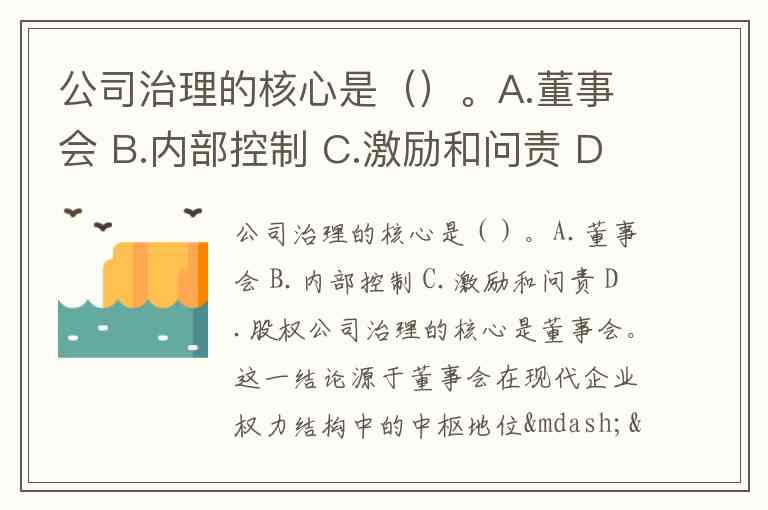 公司治理的核心是()。A.董事会 B.内部控制 C.激励和问责 D.股权