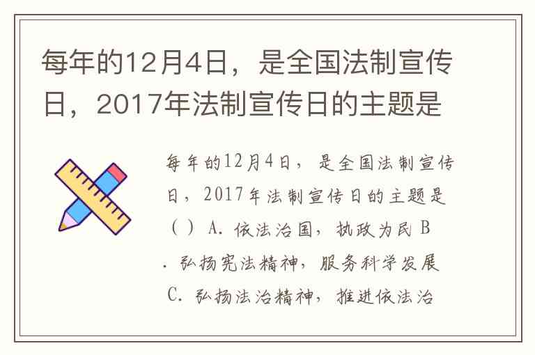 每年的12月4日,是全国法制宣传日,2017年法制宣传日的主题是() A. 依法治国,执政为民 B. 弘扬宪法精神,服务科学发展 C. 弘扬法治精神,推进依法治国 D. 学习贯彻党的十九大精神,维护宪法权威