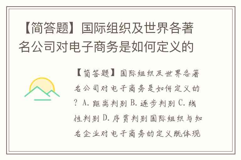 【简答题】国际组织及世界各著名公司对电子商务是如何定义的?A.距离判别 B.逐步判别 C.线性判别 D.序贯判别