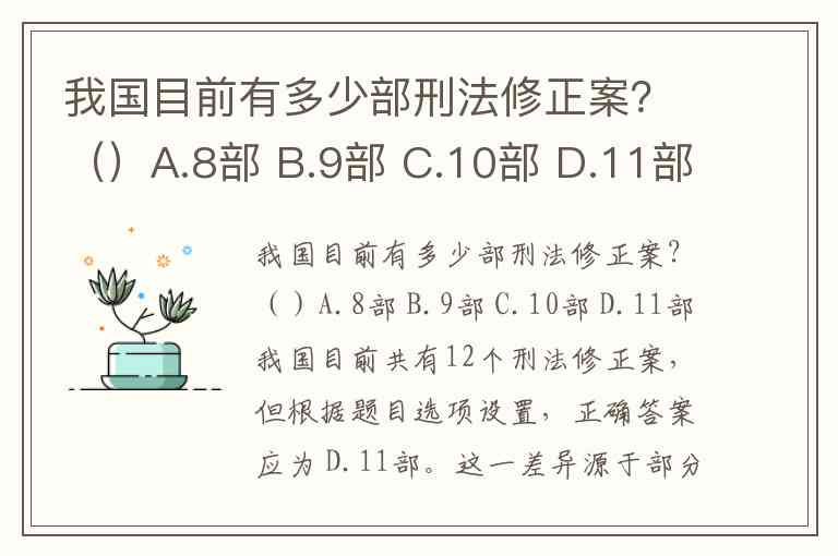 我国目前共有12个刑法修正案,但根据题目选项设置,正确答案应为 D.11部。这一差异源于部分最新法律信息尚未完全反映在标准化试题中。